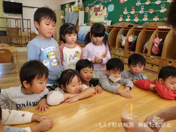 どんどん固まっていく粘土を見ながら目を丸くしながら固まった粘土にくぎ付けな子どもたち🌼