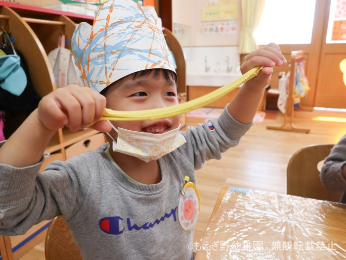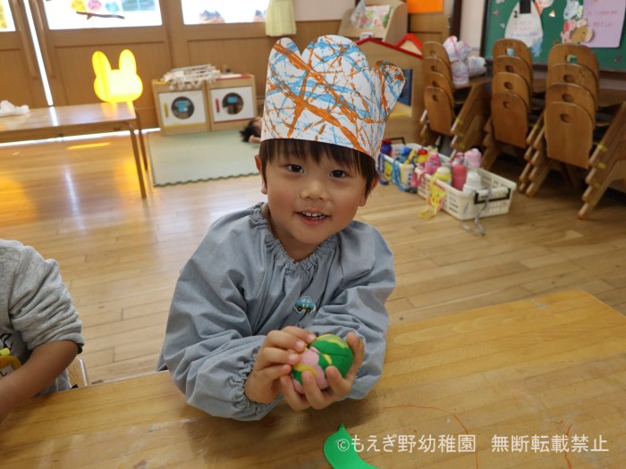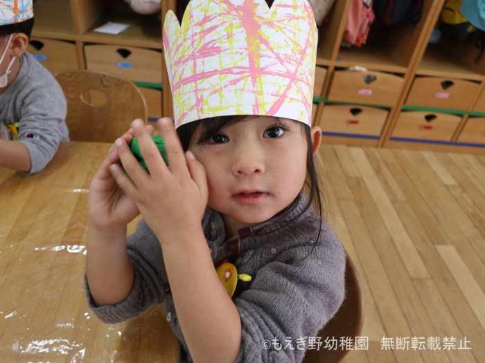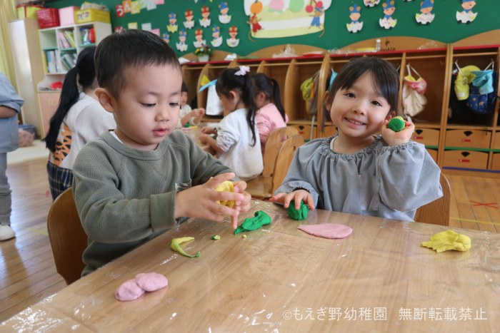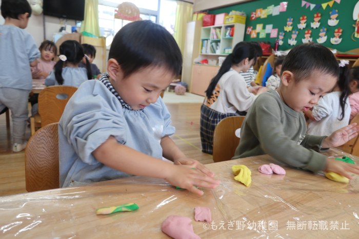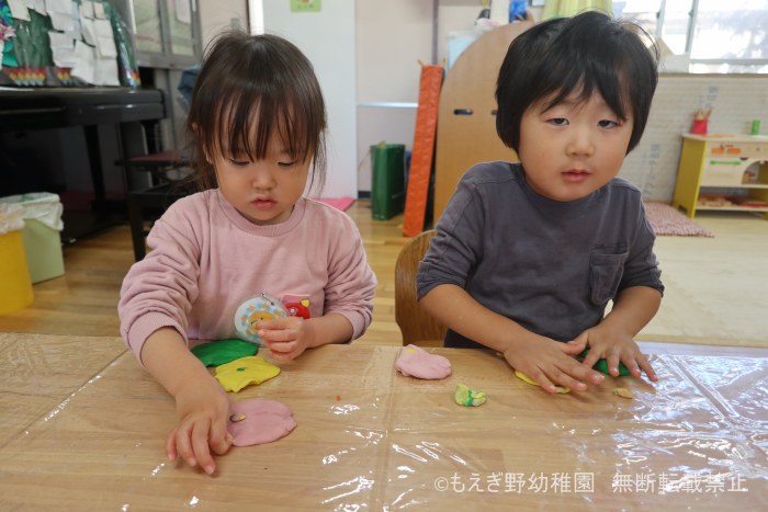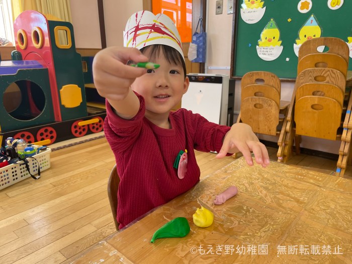 そして次はみんなの番です!緑・ピンク・黄色の3色の粘土を使って遊びました。